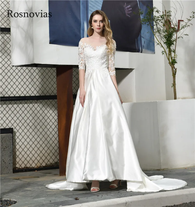 Half Sleeves Long Wedding Dresses 2020 Lace Top Scoop Open Back