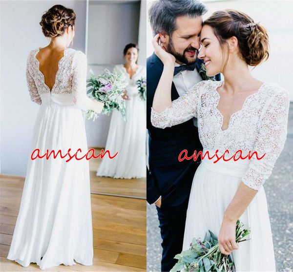 Discount Lace Top 3 4 Sleeves A Line Wedding Dresses 2020 Sexy V