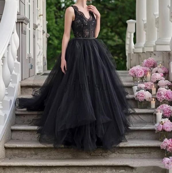 Discount Gothic Black Wedding Dresses 2020 V Neck Lace Tulle Sweep
