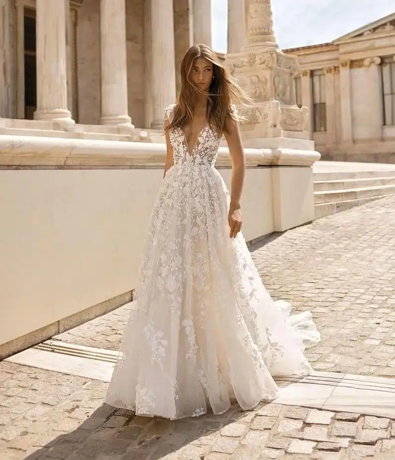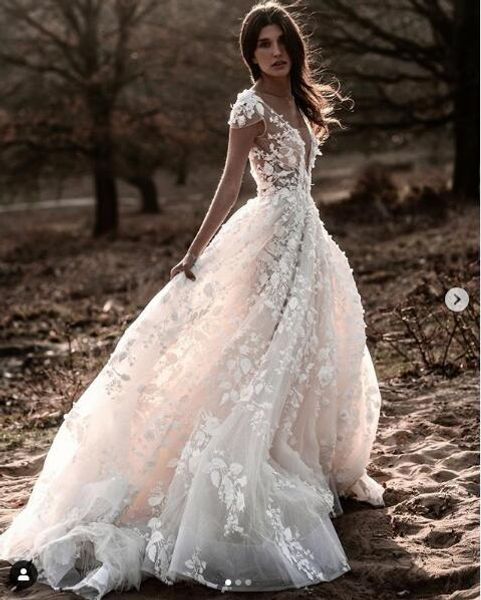 3d Floral Lace A Line Boho Wedding Gowns 2020 Backless Sexy Deep V