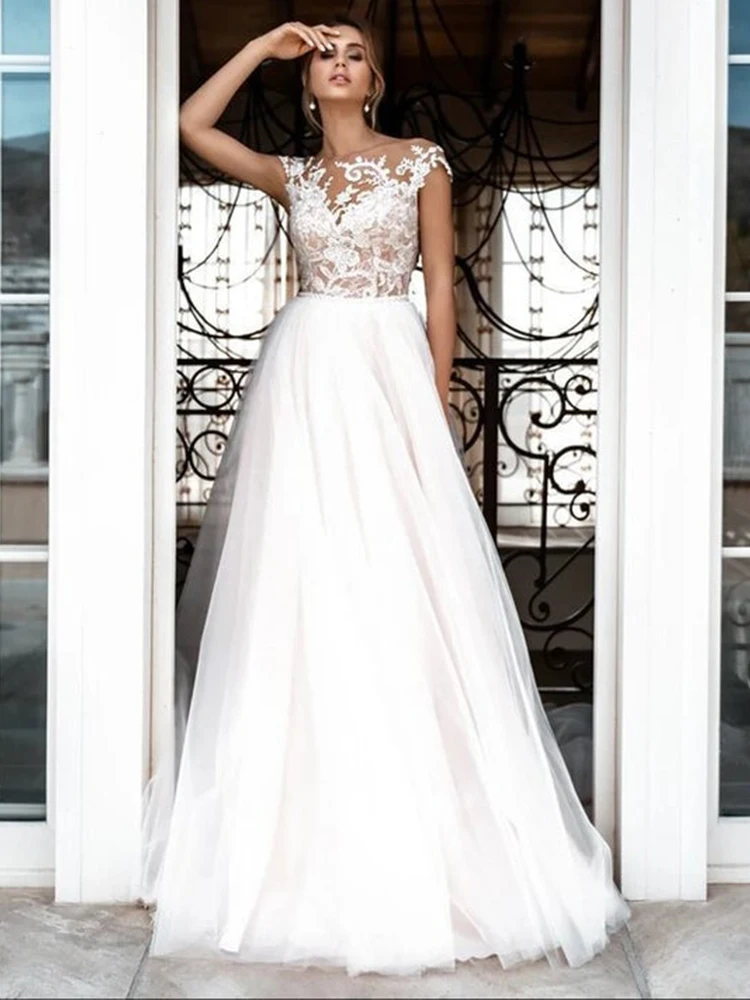 A Line Wedding Dresses 2020 Lace Applique Cap Sleeve Wedding Gown