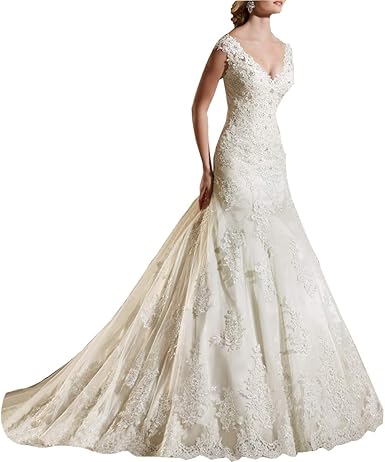 Dexinyuan Wedding Dress Cap Sleeves V Neck Appliques Beaded Zipper